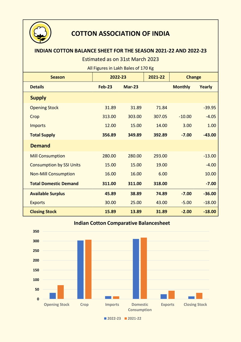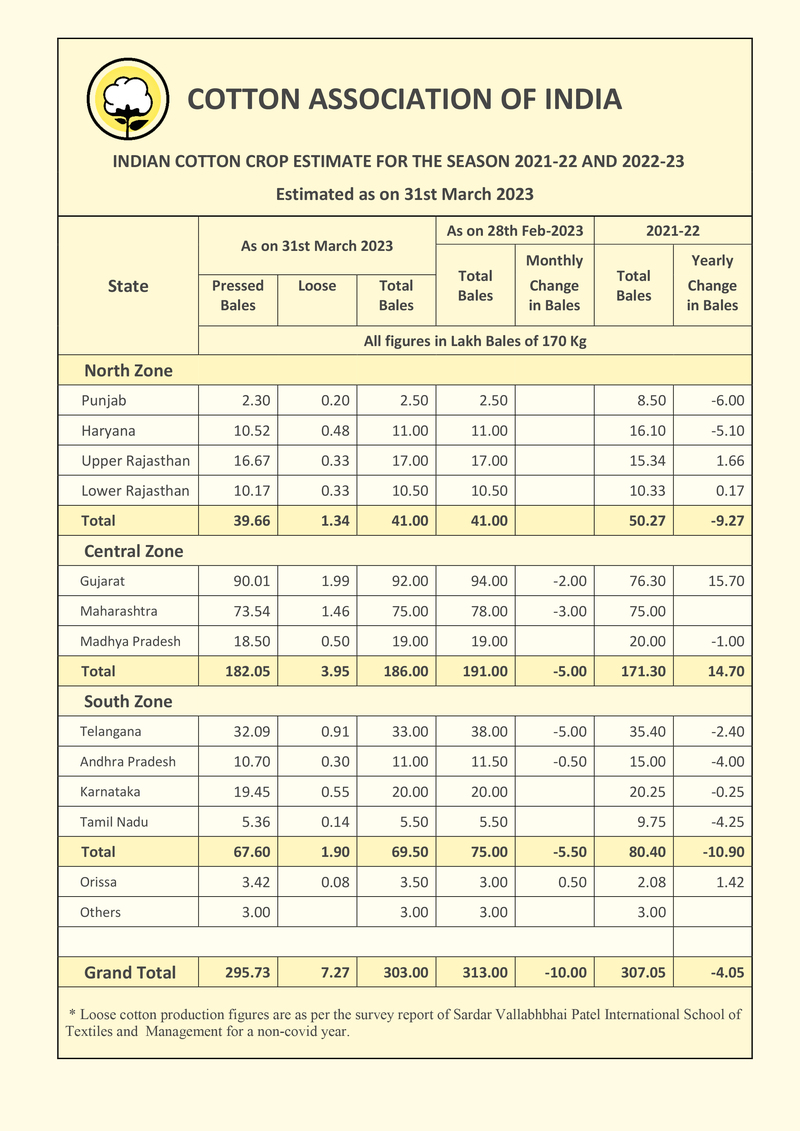 Cotton Association of India (CAI) has released its March estimate of the cotton crop for the season 2022- 23 beginning from 1st October 2022. The CAI has reduced its cotton crop estimate for the 2022-23 season to 303 lakh bales of 170 kgs. each (equivalent to 321.94 lakh running bales of 160 kgs. each). The statewise break-up of the Cotton Production and Balance Sheet for the season with the corresponding data for the previous crop year are enclosed.