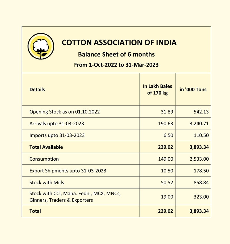 The total cotton supply for the months of October 2022 to March 2023 is estimated at 229.02 lakh bales of 170 kgs. each (equivalent to 243.33 lakh running bales of 160 kgs. each), which consists of the arrivals of 190.63 lakh bales of 170 kgs. each (equivalent to 202.54 lakh running bales of 160 kgs. each), imports of 6.50 lakh bales of 170 kgs. each (equivalent to 6.91 lakh running bales of 160 kgs. each) and the opening stock estimated by the CAI at 31.89 lakh bales of 170 kgs. each (equivalent to 33.88 lakh running bales of 160 kgs. each) at the beginning of the season.