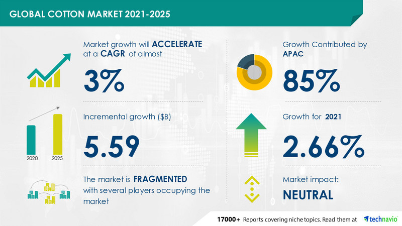 NEW YORK, March 22, 2021 /PRNewswire/ -- The cotton market is expected to reach USD 5.59 billion during 2021-2025, as per a new report from Technavio. The report also throws light on the impact of the COVID-19 pandemic, and the new opportunities and challenges that market players can expect. In this market analysis, the market is expected to accelerate at a CAGR of almost 3% during the forecast period.
