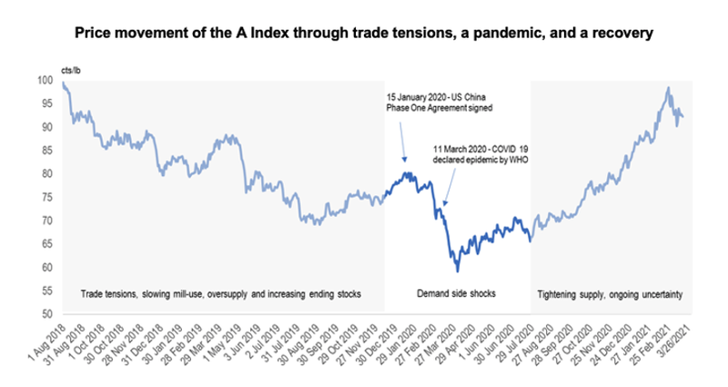 The Secretariat’s current price projection for the year-end 2020/21 average of the A Index is 78.5 cents per pound this month.