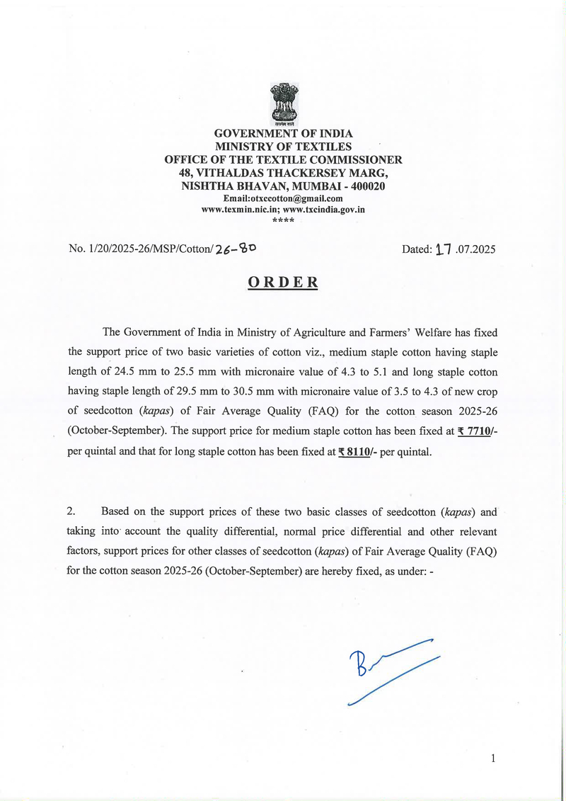 MSP Order for the cotton season 2025-2026