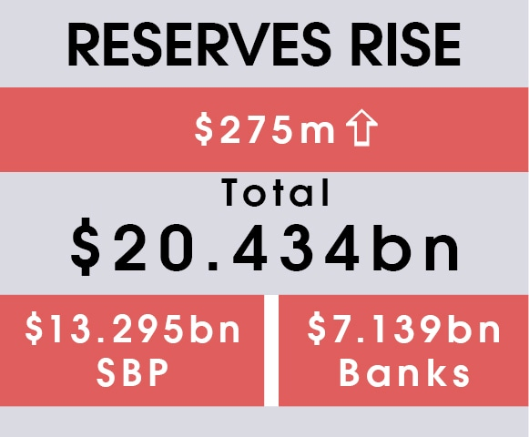 KARACHI: Foreign exchange reserves of the State Bank (SBP) increased by $275 million to $13.295 billion during the week ended on March 19.